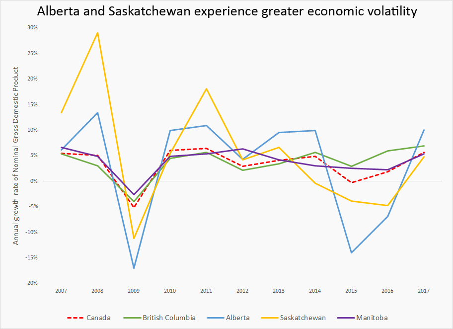 Alberta and Saskatchewan's growth is three times more volatile that the average for all provinces, mainly due to their higher dependence on resource sectors. Overall, British Columbia and Manitoba have more diverse industries and employment. However, communities and regions in both of these provinces also face major challenges when local mines or forestry mills close due to low commodity prices.