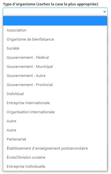 Un organisme détenu ou dirigé en majorité s’entend d’un organisme ayant au moins un groupe prioritaire pour la croissance de l’inclusion au niveau fédéral, qui contrôle et gère à long terme l’organisme et qui joue un rôle actif dans le processus décisionnel stratégique et courant. Le cas échéant, veuillez indiquer si votre organisme est détenu ou dirigé en majorité par au moins un des groupes faisant partie de la liste. Cette information ne sera pas utilisée aux fins du processus d’évaluation. Les données agrégées et anonymes peuvent être transmises à d’autres organismes fédéraux ou publiées à des fins de production de rapports et de surveillance. Si vous ne savez pas si un groupe particulier est représenté dans l’équipe de gestion, ou si vous préférez ne pas répondre, veuillez sélectionner « Préfère ne pas répondre/Ne sais pas » dans le menu déroulant.