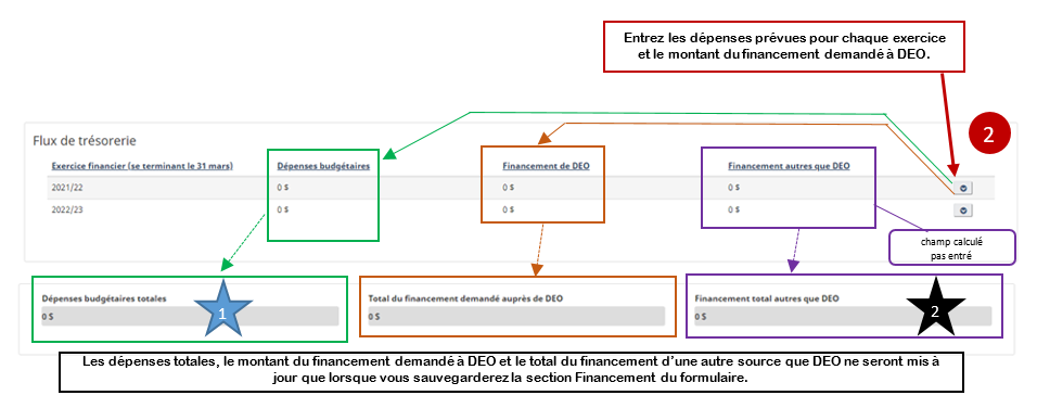Remarque : Ce total doit être égal au « Financement total d’une autre source que DEO » de la section « Flux de trésorerie » ci-dessus.
